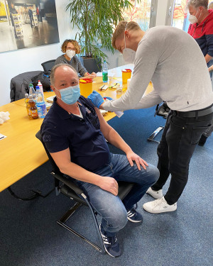 Wie schon im Mai konnte das Ärzteteam Dr. med. Pirkko Weise und Dr. med. Meinhard Gödecke für diese Aktion gewonnen werden, die direkt in der Firmenzentrale in der Griesheimer Wiesenstraße stattfand. Verimpft wurde der Impfstoff der Mainzer Firma Biontech.